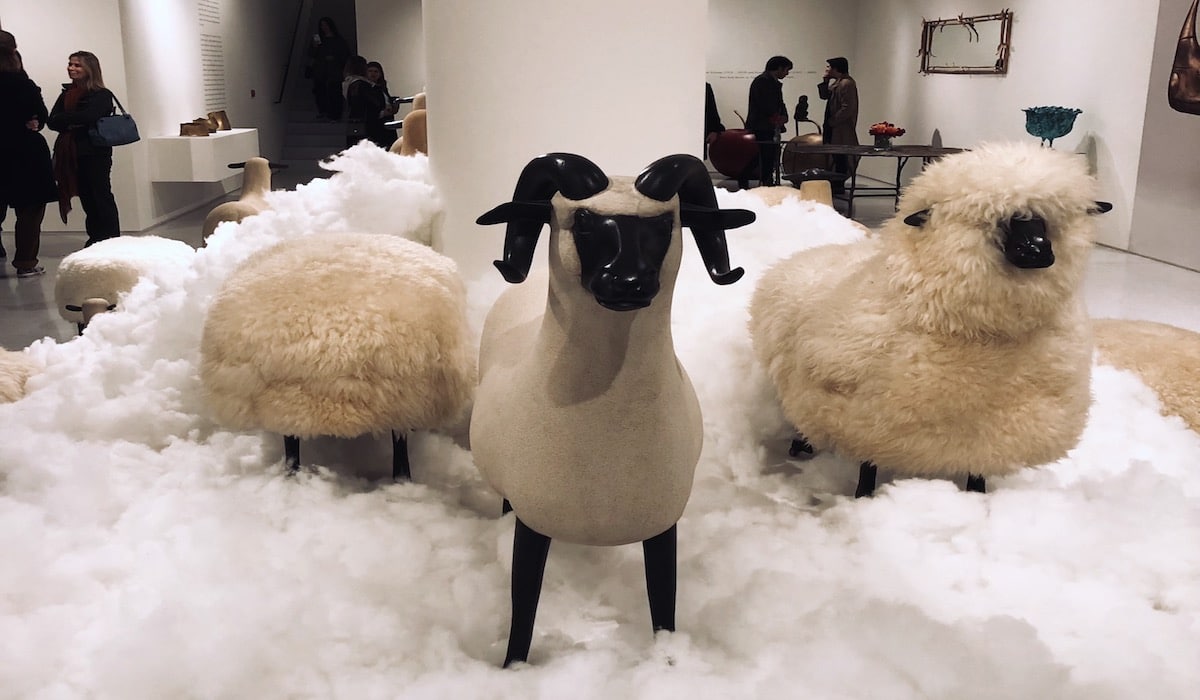 The exhibition also features Claude’s never previously displayed Lit Hibou et 2 Tables de Chevet – a bespoke bed and two side tables commissioned for a collector – and François-Xavier’s cleverly functional Hippopotame II (Bar), which opens to reveal a full and fully functioning bar. Their works consistently blur the line between functional design, fine art and decorative arts. A flock of Lalanne sheep, ‘moutons de laine’ – a series first exhibited in Paris in 1966 – reflects François-Xavier’s desire to bring country life to Paris while also mocking the herd mentality of the bourgeoisie. Les Lalannes’ characteristic wit is also to the fore in the other works shown, which showcase all aspects of their oeuvre and include Claude’s fanciful ginkgo tables and chairs, flora-adorned mirrors, electroplated copper and bronze chandeliers, candelabra and lanterns, plus a fantastical bronze bestiary from François-Xavier including a pair of wild boars, a monumental standing bear and a wild horned goat. Their ethic was to create dreams – Claude said: “I dream when I am awake. There is nothing left over by night” – and the decision of the curators to show their work in a dream-like space honours that ethos.
