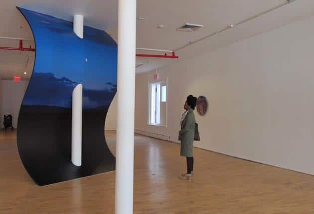 “Holey Wave (Cortlandt alley),2013” is an aluminum mounted photograph that hangs in front of an actual window. Outdoor street light literally leaks thru Letha’s carefully cut and folded circles punctured throughout the photograph. NYC’s natural light mingles among the rocky mountains within the photo. The most striking work of all is “Moon Wave” , which sits in the center of the room. It is a floor to ceiling photo, mounted on a curled wood poplar backing. The image is a nocturnal desert scene, replete with hanging moon. Standing before the work evokes the same stillness of the night as when the photo was taken, as the work’s horizon line is perfectly scaled to human proportion. To disrupt us from this tranquil moment in nature however, Letha has impaled the photo with a structural white column smack center. The column’s sharp intrusion along with the s- shaped curve of the mounted photo give the piece an almost Dali-esque melting of time and the image.