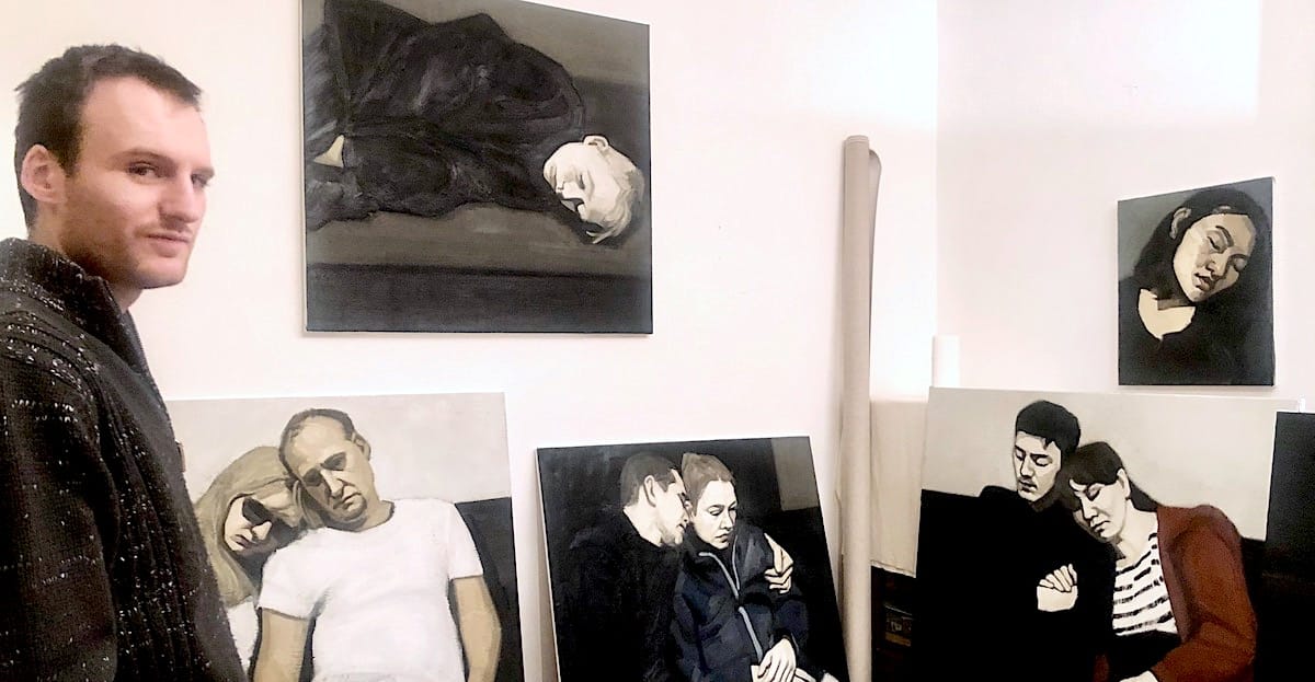 He is now painting from photography. Venturing to depict people he has seen in the Paris Metro, such as exhausted couples lying on each other or holding hands. (see top photo) His subjects are mostly static. There is tenderness in the artist’s gaze and both an element of fragility and humanity. And definitely poetry. Over the years, his portraits have evolved from being detailed in the composition, the subject and the surroundings towards a form of simplicity. Abstraction has appeared in the figurative canvases. The forms, the background have blurred. The painter has focused on capturing an emotion in his subjects. The chromatic palette has become darker with cool colours providing an impression of calm and even of melancholy. Black becomes more prominent in the canvas, with nervous and rapid brushstrokes playing with light and shadows.