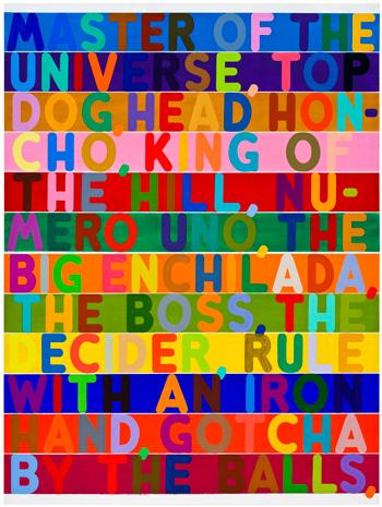The exhibition traces nearly 50 years of Bochner’s work, from the late 1960s to today, showing his fascination with language and colour. It will include a vast 30 metre-wide painting, installations filling the galleries and large works painted directly onto the walls. The exhibition presents his recent ‘Thesaurus’ paintings, colourful word chains which descend from phrases such as ‘top dog’ and ‘king of the hill’ into more macho mantras such as ‘rule with an iron hand’.
