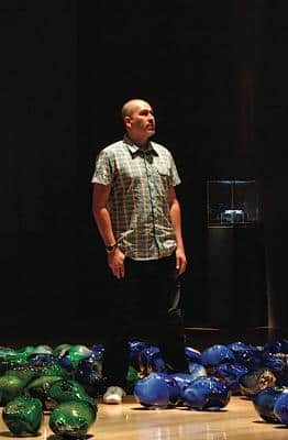 Joshua D’s Wall features is a field of 250 hand-blown glass stones that are scattered over the gallery’s floor. Joshua D’s Wall alludes to the Biblical story of Joshua and the crumbling walls of Jericho. Resembling small boulders, these glass stones evoke the earth’s magma and the many colors found therein, as well as Petry’s own artistic impression of the natural environment.When visiting the museum, he was astounded by the lava rock that forms the walls of the museum’s building. Petry’s work is a direct response to the Palm Springs Art Museum’s architecture and its location near Joshua Tree National Park.