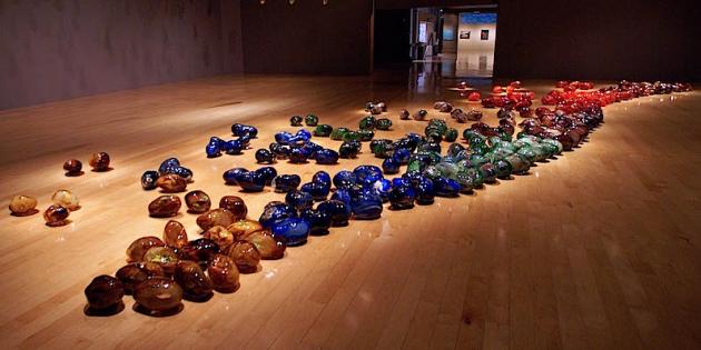 Petry’s work is made up from hundreds of unique glass stones made at the Berengo studios in Murano, Italy. Each stone is a unique artwork in itself (a treasure) and like Joshua’s instruction to destroy the city, Petry’s installation is slowly destroyed as each stone is sold, the whole becomes smaller. It is the only work Petry has made where the multiple parts can be broken up.