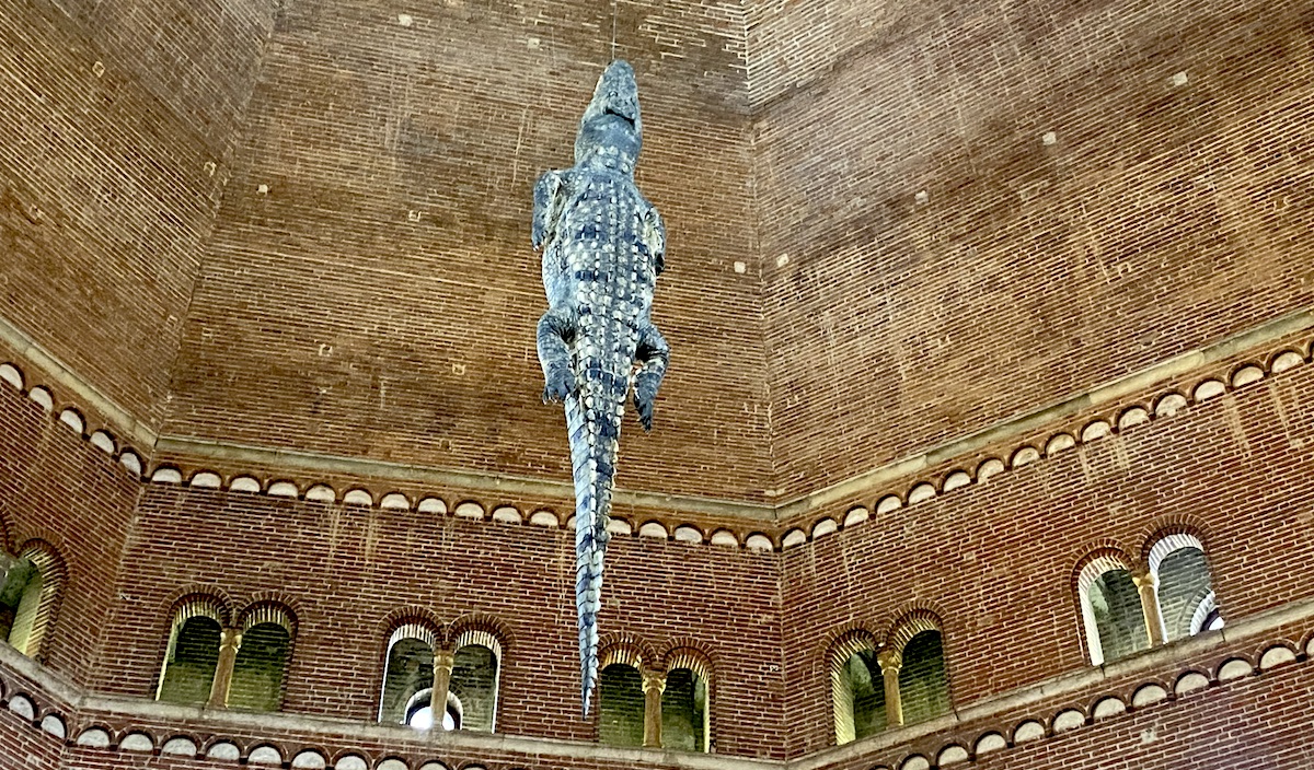 The eight-sided Battistero (Baptistry), built in 1167, is a perfect setting for Maurizio Cattelan’s “Ego.” The taxidermied life-sized crocodile, suspended with a dangling tail, was first exhibited in 2019 in Blenheim Palace in Oxford, England, but this is the first showing in Italy. In the bricked octagonal setting, the crocodile is bathed in light filtered from two lancet windows and a stained glass window in the centre of the dome. The tail faces the baptismal font, and the mouth opens towards the skylit dome. This presentation of unconventional art in sacred places resulted in a controversy covered by the Italian media.