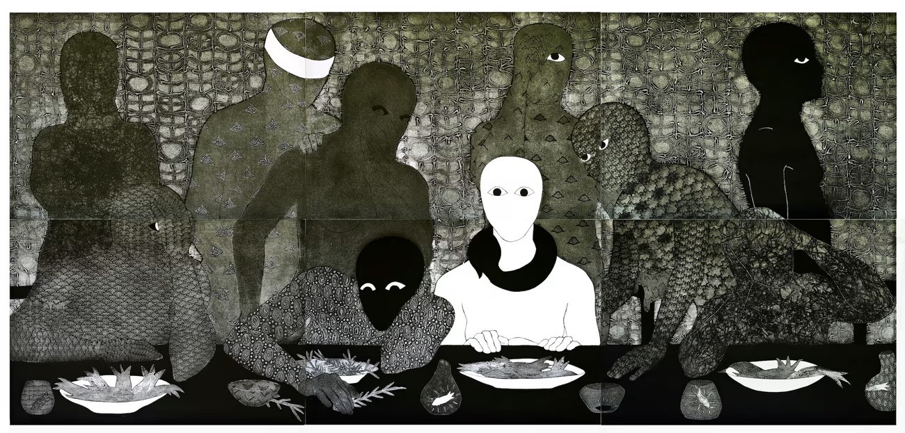 However, the key to these works is the conflict and struggle between matriarchy and patriarchy, which is being worked out within them. ‘La Pesca I (Fishing I)’ is an early coloured print depicting women fishing in a river, as was their exclusive right at the time before patriarchal control was introduced. In’ La cena (The Supper)’, as Frank writes, Ayón “riffs off the familiar image of The Last Supper, with Sikán replacing Jesus at the centre of the table, and an assembly of lattice-laden shadow figures, also women, at her sides”. In ‘Resurrección (Resurrection), Sikán demonstrates her power by raising her white arms while a contrite man bows before her miraculous return. In these ways, as Frank suggests, “Together Sikán and Ayón challenged a realm of knowledge ordained solely for men, art serving as an alternative means of communication that rests on the power of the eyes, not the tongue.”