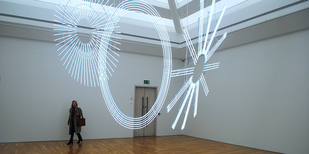 Lead image: Cerith Wyn Evans with ‘Radiant fold (….the Illuminating Gas)’, 2017/18, National Museum Cardiff. Photo: © P A Black 2018.