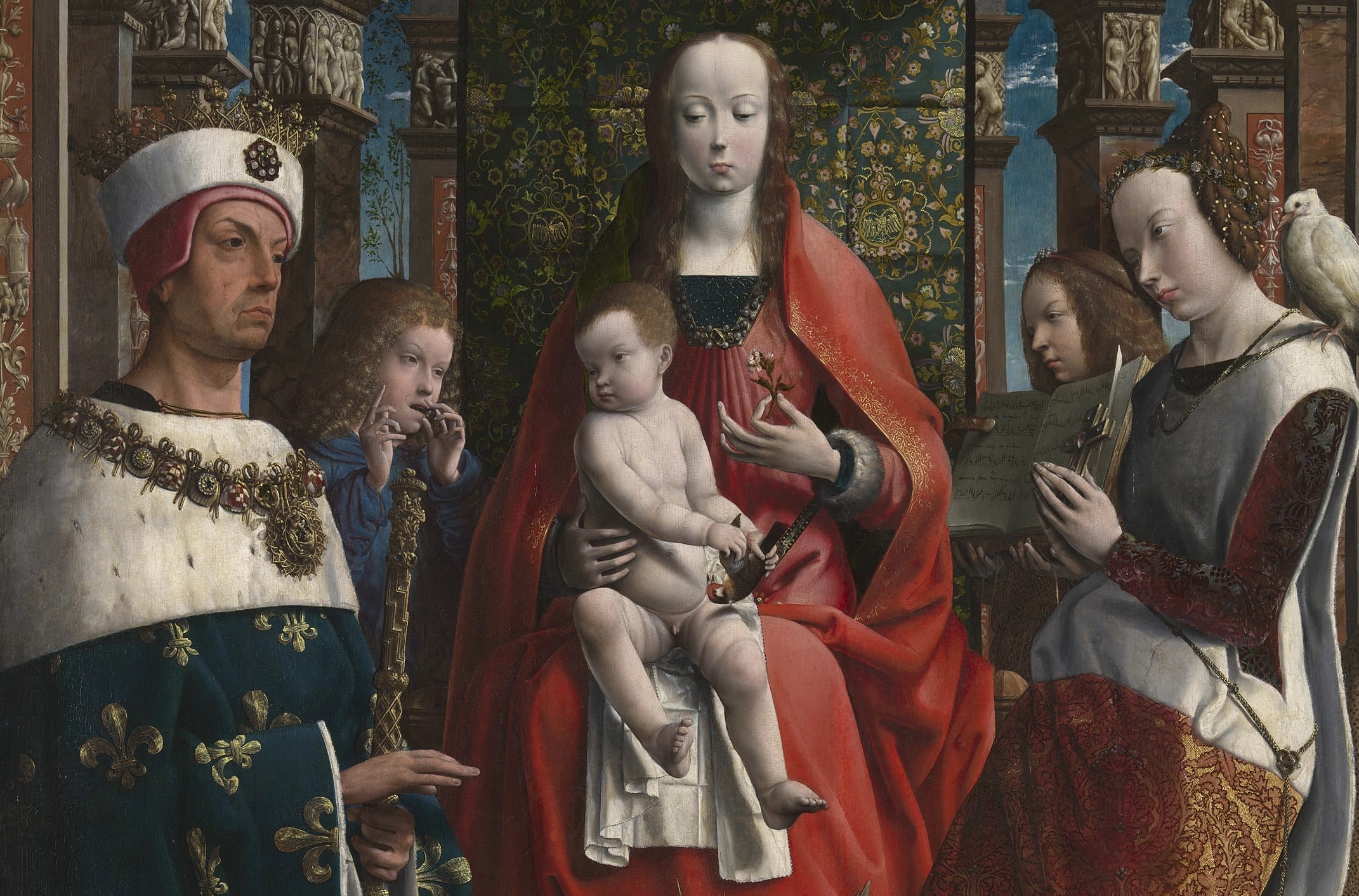 Stylistically, the work bridges influences. The dramatic foreshortening of faces recalls early Jan Gossaert, while its luminous textures pay homage to Netherlandish masters like Van Eyck and Van der Goes. Yet the monumental figures and strong shadows evoke French painters such as Jean Hey, the Master of Moulins. Dendrochronology dates the Baltic oak panel to after 1483, while Saint Louis’s Order of Saint Michael collar—modified in 1516—suggests a completion date before then.