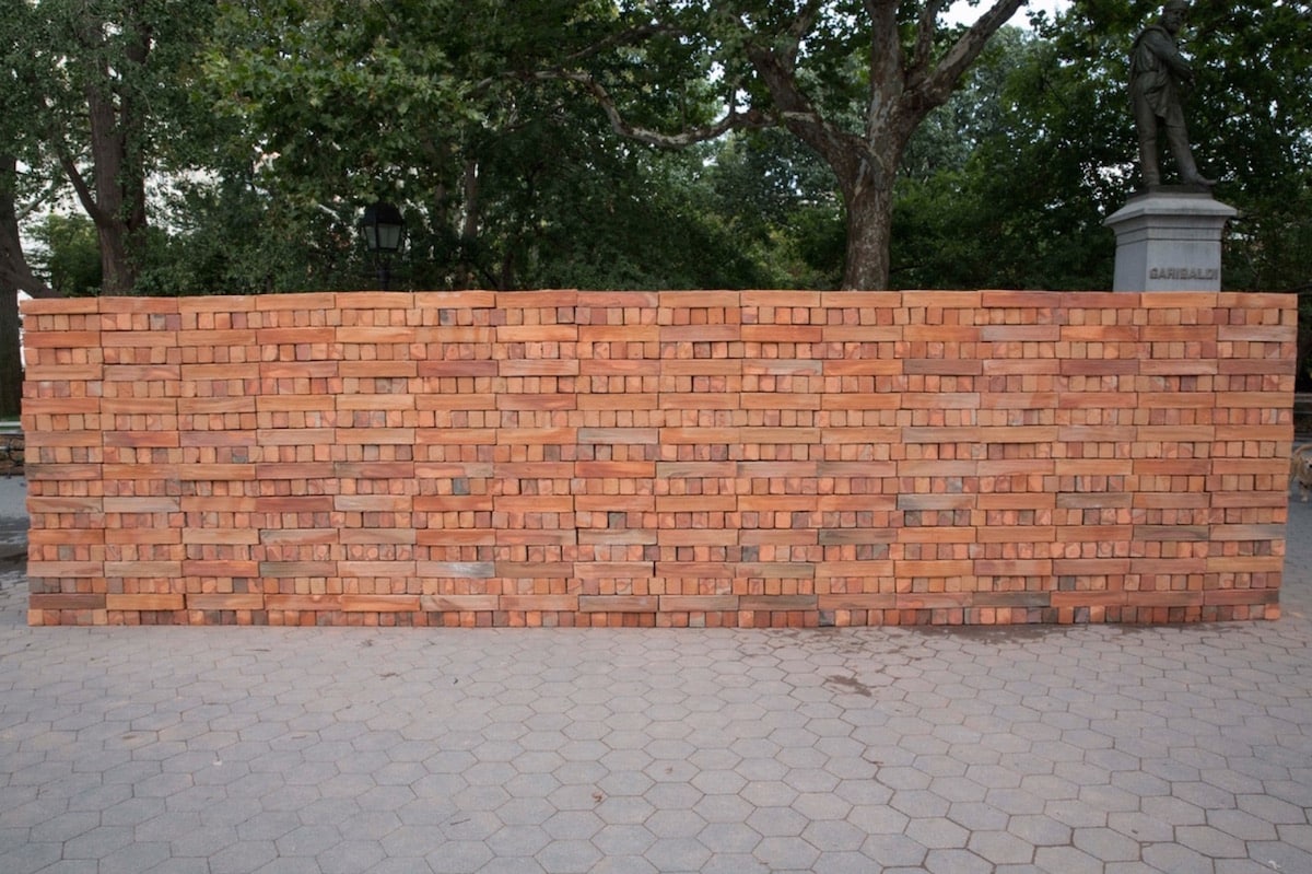 In the interest of dismantling, rather than building exclusionary walls, Mexican artist Bosco Sodi’s first public installation was a 2 meter by an 8-meter brick wall. Made of hand-fired clay timbers created in Oxaca, “Muro” was constructed on the same day that hundreds of people waited on line to remove a single brick. Signed by the artist, “Muro” became a communally owned artwork. An eloquent response to the current wall mania that represents America at it’s xenophobic worst.