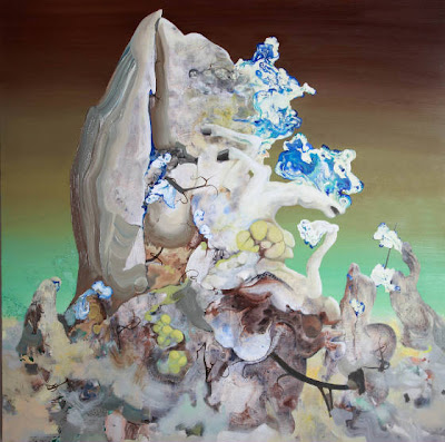 The young Japanese artist, Daisuke Ohba, makes shiftingly mysterious abstract and landscape paintings which stand in for flux in the world. He layers iridescent pearl paint over other colours so that from some angles and in some lights, all is grey; whereas from other angles or in other lights, manifold colours shimmer into view – sort of Cruz-Diez done naturally. The mystery, to me at least, is why exactly the effect occurs: as neither Ohba’s gallerist nor the show’s curator could enlighten me at the opening, I don’t feel too ignorant, but trying to work that out provides another reason to attend Answers welcome!