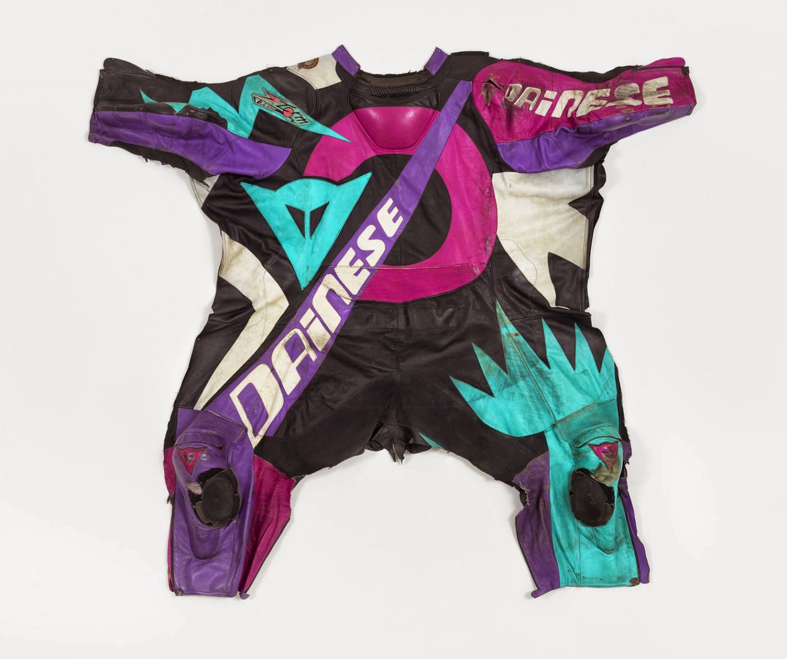 Cologne-based Alexandra Bircken – best-known for incorporating knitting with found items – is a motorcycling enthusiast. At Frieze, she re-purposed sets of racing leathers as paintings of sorts, complete with the sculptural protectors of knees and elbows. Her intervention is to slit the leathers open, ending its usefulness, then play like a carcass bearing the traces of competitive action.