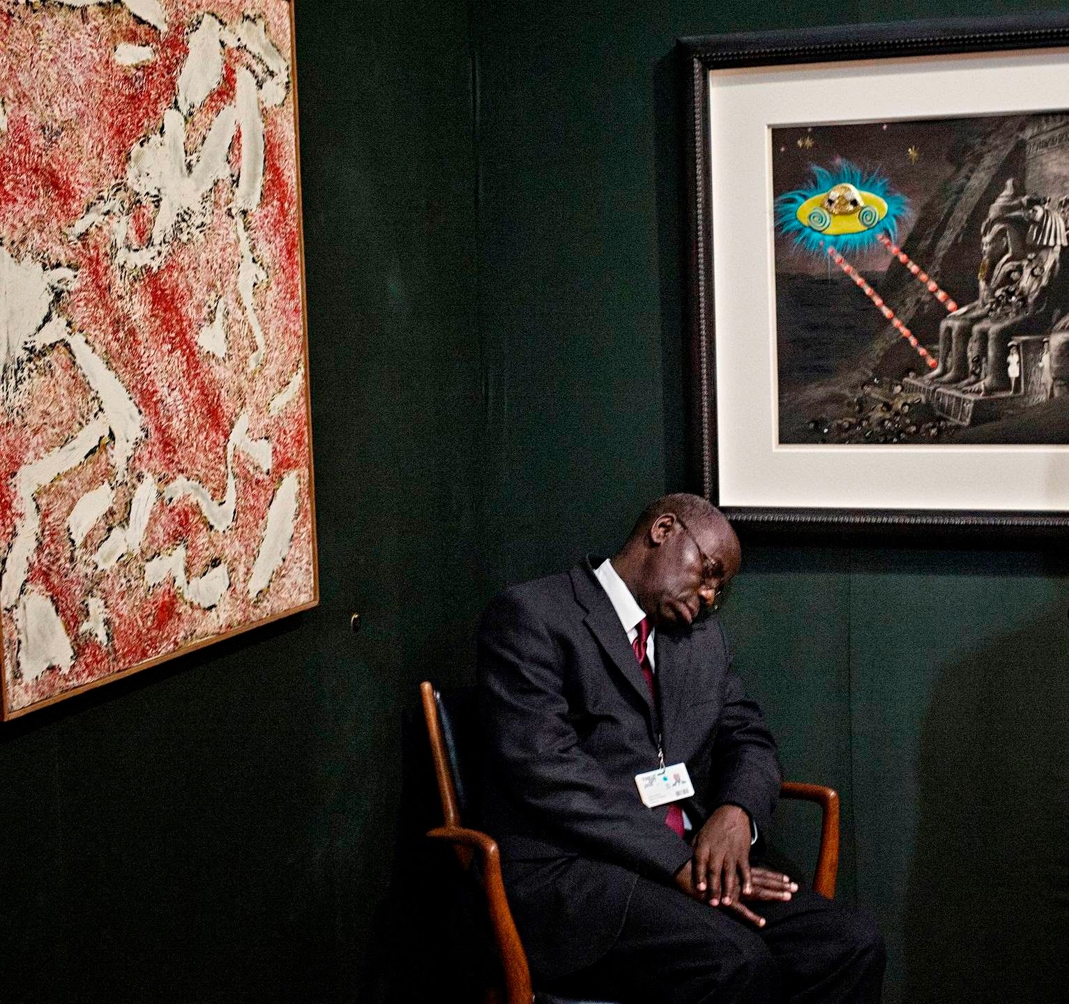 Lebanese media artist Walid Raad merges contrasting languages in these 27 prints, for which he fed the computer the many business cards he has been given over the years. They are said to mimic the formal approaches of the cool proto-Minimalist abstract 1940’s paintings of the Palestinian Suha Traboulsi (born 1923). Presumably Waad has invented her as a paradigm case of how any such woman’s art would have been overridden by corporate male cultures.