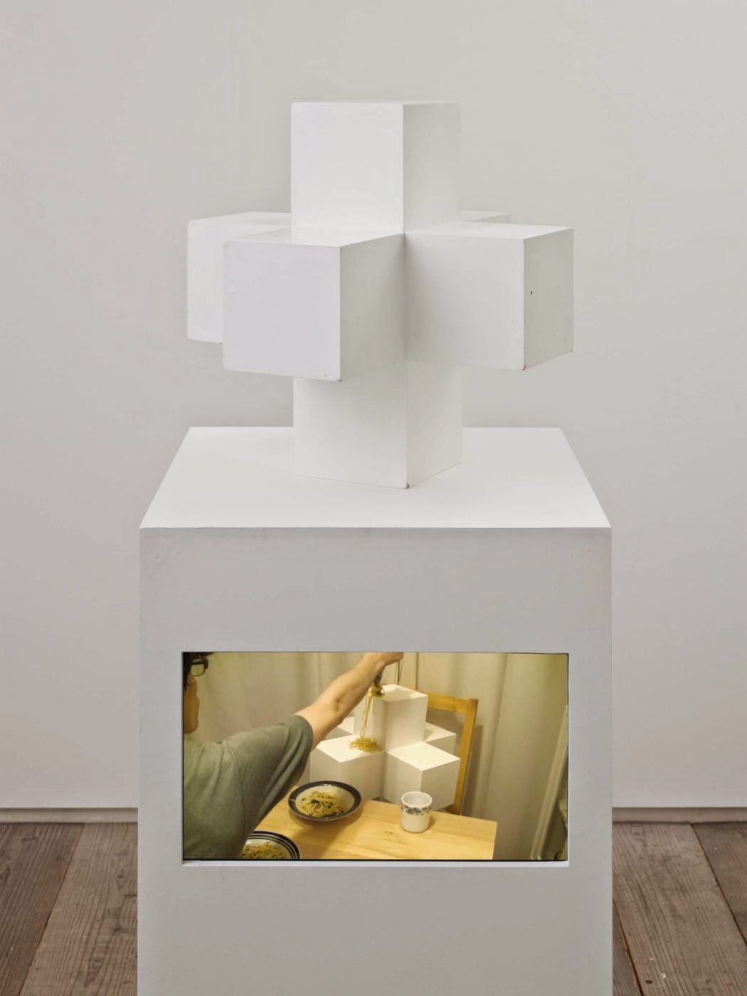 It’s difficult to generate uselessness in quite the same way in film, but Fluxus-influenced Japanese artist Taro Izumi pursues a related path in a set of videos for each of which he produced a cumbersome white ‘anti-social’ abstract sculpture (seen on top of the monitors), and asked participants to integrate them into their everyday lives. We see various shapes being washed, fed and put to bed… So just what is the connection between art and reality?