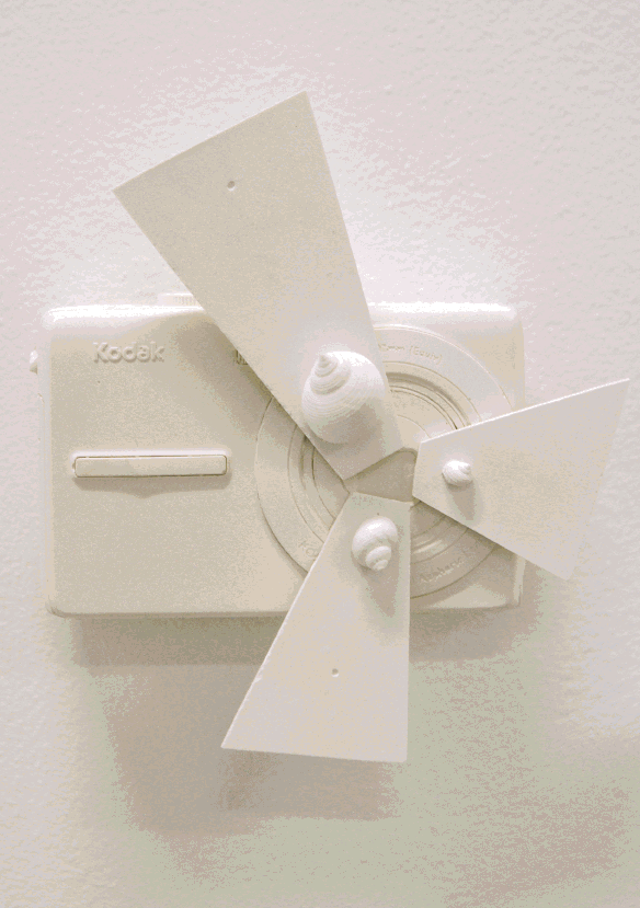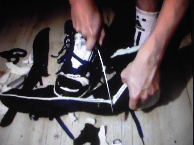 Charlotte Prodger presents a complex but compelling installation which draws analogies between structural film and themes of obsession and obsolescence in popular/gay culture using four elements: on-line footage of the fetishisation of black and white Nike trainers, including cutting and pulling them apart in what seems a rather sexual desire to see and understand all of an adored object; a double 8mm film splitter standing in for how mid-sixties artists deconstructed film into its constituent elements; a Sharp GF 777 boombox, now more for display than for use on the street; and a fragmentary narrative playing on it which links all that to the opening and closing of the blinds in a sex club in Berlin… ‘Phew!’ you might say, and yes, it was a bit amazing that it worked…