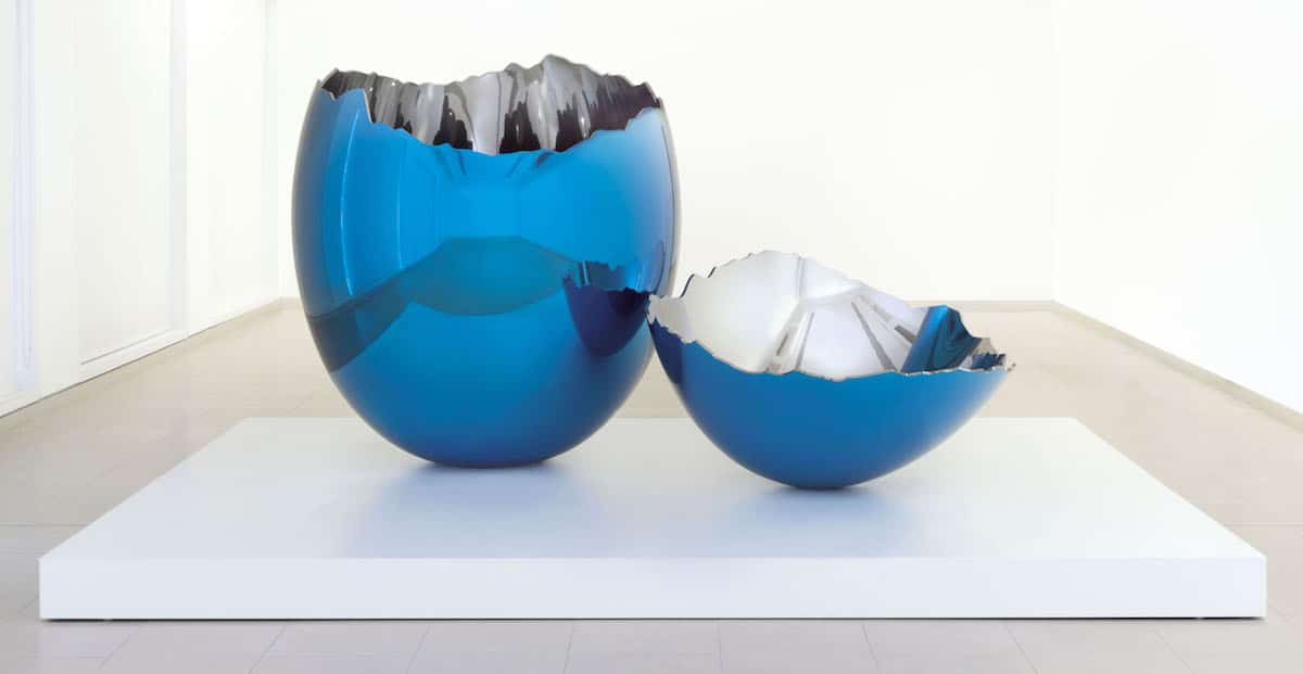 Jeff Koons Cracked Egg (Blue) a large two-part stainless steel sculpture from the Celebration Series, which began with Balloon Dog in 1994, is the...
