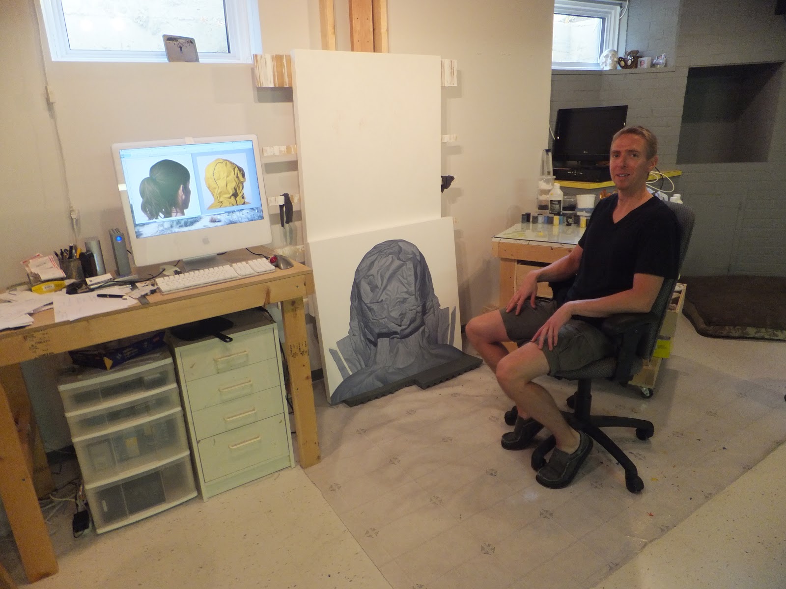 Karel (say ‘Carl’) Funk’s name has East European origins, but he was born in Winnipeg in 1971. His work is the epitome of intense application to a narrow range of focus: for fifteen years he has painted nothing but heads, often turned away or hidden by clothing which Funk provides. Nor has his basic technique changed: Funk himself takes multiple photographs of the subject, shot in the studio downstairs from his living space; 3 or 4 of that then form the starting point for the most basic of underdrawings on an MDF board, followed by hundreds of semi-translucent layers of acrylic. That fills out the image in a level of investigative detail which persuades equally from close to or far from the canvas. Funk works on one painting at a time, as a systematic full-time job, and finishes five in a good year.