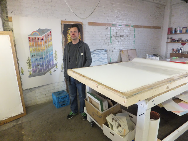 Hughes has a wide range, including video, various styles of painting and collage, and the investigation of his children’s drawings. He tends to pursue particular strands within that mix across several years. Thus, he’s just coming to the end of a ten year cycle of precision-drawn watercolours of imagined buildings. They combine modernist architecture with the vernacular of log cabins, pushing the latter to implausible extreme, and are populated by stuck-on people representative of Canada’s history, including recurring participants from a set of stickers sold with the national flag. Hughes sees the buildings as representing the conflicted mental states which the occupants may be enacting.