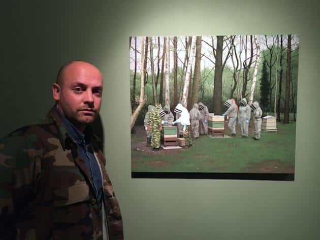 Where else do you find drones? In the structured society of the bee colony of course, with its natural division of labour. The painting Wage War presents a version of Stark’s apiarists, faces obscured, a mysterious transaction going on, the protective suits remodelled to suggest youths in hoodies and soldiers in uniform. The title comes from the Kosinski excerpt, which was later lifted by Robert Calvert of Hawkwind fame and titled Wage War. It conflates the economic (‘we’re battling for a fair wage’) with the military (‘we’re going to war’). And what is that ceremonial laying on of hands? A honey sale agreed or the swearing of allegiance to a plot?