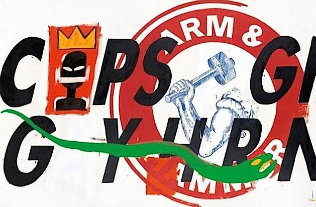 Executed in 1984, this work blurs the boundaries between commercial art and graffiti and unites two of the most important painters of the 20th century onto a single and powerful canvas. Basquiat and his mentor worked together closely on this collaboration in between workout appointments with Warhol’s trainer, downtown dinners and parties. The result was a merging of two distinct art systems: the cool commercialism and pop culture aesthetic of Warhol and the expressive, impulsive, gestural urban imagery of Basquiat. At almost two metres high and three metres wide, the image takes on billboard-like proportions, matching the fame both artists had achieved by the time of their collaboration.