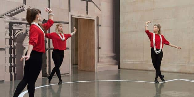 Tate Visitors will be confronted with two large scale architectural structures spanning the width of the Duveens. Each is overlaid with visually manipulated images taken from Tate Britain’s exterior architecture, visually turning the gallery inside out. At its centre three classically trained dancers continually weave up and down the gallery, blending gestures and movements of Baroque choreography with the minimalist style of contemporary dance.