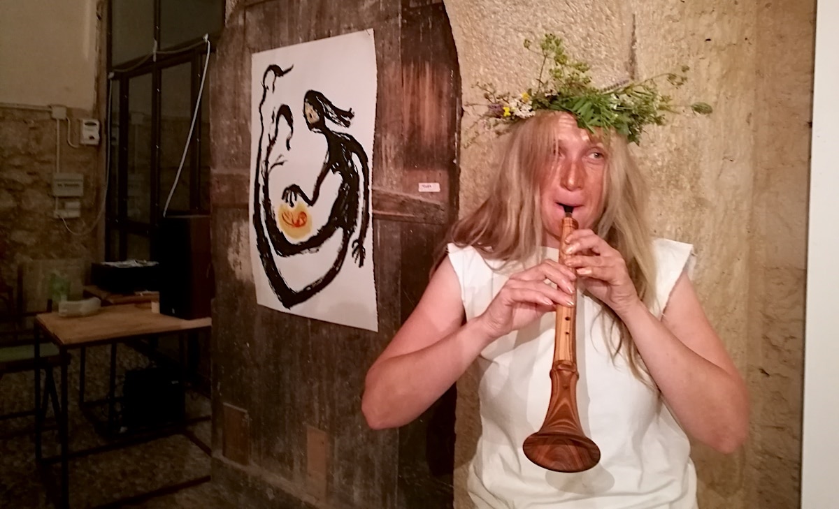 At the closing of our time in Atina our exhibition coincided with the Festival Della Storia, a festival of literature and guests which travels the different towns of the Val di Comino. Some of the artists improvised a procession through the town, greeting and giving a theatrical sparkle to the cobble streets and ancient buildings. The performers who took part in this activity were Alexandra Santos (Saturn’s Daughter), Ali Darke (Mefiti’s High Priestess), Riitta Hakkarainen (The Giant Ghost Nun of the Asilo Infantile Beatrice), Jude Cowan Montague (La Contessa Arancione del Sole Notturno). We hope to contribute formally to the Festival in 2020 when we return. Lisa McKendrick (Nnja Riot) who created a series of works imagining Mefiti including an audio performance using found sound collected during the residency. She was one of the initiators of the artist procession through the town and her work of drawings and masks explored the re-imagining of the buried goddess.