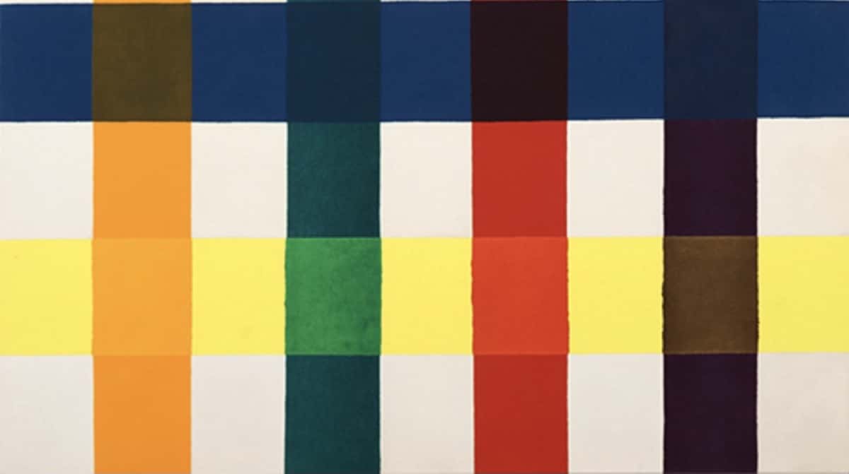 Reed was methodical in his painting, his works fall into considered series; as he developed and refined an idea. The last work of a series is usually the largest, most complex, or has the greatest clarity. In 1965 Reed created his well-known series- the Disk paintings – where two corners of different color are set off by a diagonal band with a large circle at its center. With these works Reed blended colors by overlapping layers of separate colors, something that was distinct to the new water-based acrylic paints then available. Next Reed created compositions of zigzagging stripes where each line kept its pure color yet created secondary colors at each bend in the Upstart series of 1965. Further color overlapping was explored with the “plaid” effect of grids in the series Interchange, Inside Out, and Coherence of 1966. One of Reed’sCoherence paintings belonging to the permanent collection of the National Gallery of Art was recently on view there. Within the Washington Color School, Reed was recognized as the most successful at using the transparency new acrylic paints offered to overlap colors, somethingMorris Louis (1912-1962) had explored in his Veil paintings but abandoned as he could not achieve the vibrancy he desired with the first generation of acrylic paints, Magna.