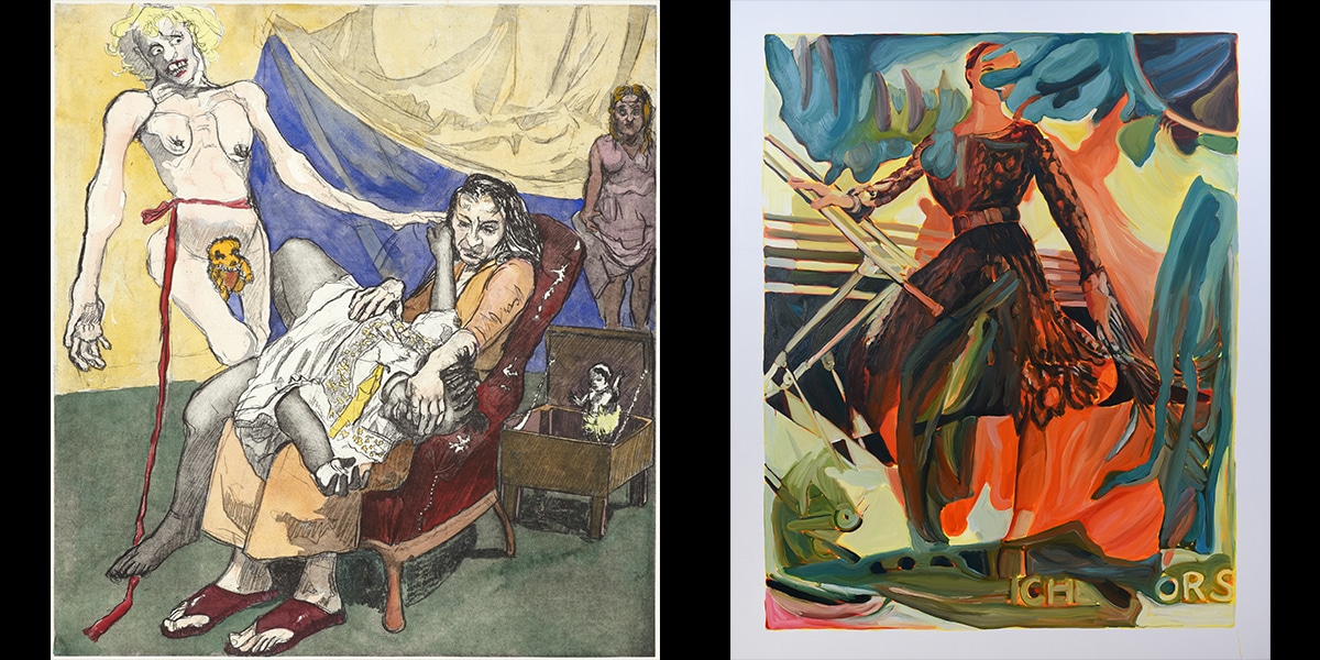 Scott said: “When the opportunity arose to exhibit my work alongside the prints of Paula Rego, I didn’t hesitate – I was intrigued to see how the dialogue between us, two female artists from different generations would develop. Rego often portrays women in secretive or clandestine groups, or alone confronting their private agonies. I am interested to contrast these with my recent paintings that re-examine public images of women. Taking source images from glossy magazines and overwriting or ‘defacing’ these, my paintings aim to expose the hypocrisies of our so-called sexual freedom.”