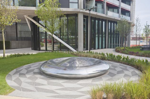 The title describes the location co-ordinates of the gallery and the works reflect the artist’s interest in a human relationship to space and modernity, a fascination with the built environment, and the inherent potential for communication in a city. The centrepiece of the exhibition is a full-sized prototype of a Skystation sculpture by Newman, recently commissioned for Riverlight, a new St James residential development in Nine Elms, London. The permanent sculpture measures over four meters in diameter. Made from cast and polished aluminium, it is located on a public footpath next to the Thames – among the buildings designed by Rogers, Stirk, Harbour & Partners – close to the new US Embassy.