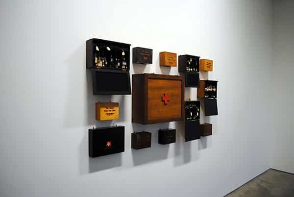 Lead Image: Susan Hiller, Emergency Case: Homage to Joseph Beuys 2012, 13 wooden felt-lined first aid cabinets, containing bottles of holy water and vintage first aid supplies, Lisson Gallery. Photo: P A Black © Artlyst 2015.