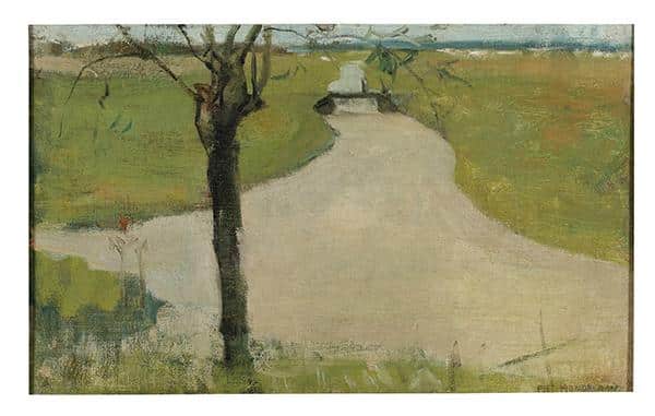 The dense, small-scale paintings included in this exhibition mark a highly prolific period in Mondrian’s engagement with figurative landscape painting—an early but deeply significant stage in the artist’s methodical progression from naturalistic representation to complete grid-based abstraction. Prior to moving to Paris in 1911 at age 39, Mondrian spent the early part of his life in his native country of the Netherlands, where he attended the National Academy of Fine Arts in Amsterdam from 1892 to 1897.