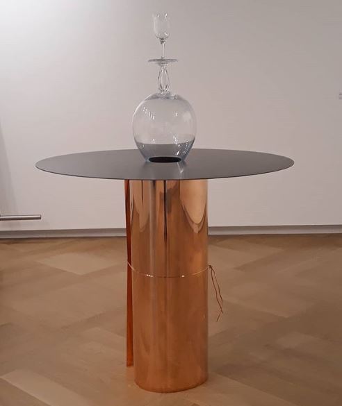 Melotti also features in this cool show of Italian sculpture, much of which looks as if it could lose its balance any time. Here is Remo Salvadori’s ‘Verticale’ 1991, which simply encircles a roll of copper with a cord to provide a tenuous structure on which a tabular flatness, a very large glass and one normal glass (plus the odd unauthorised addition at the opening) are balanced to suggest relationships just about in equilibrium. Is that a heavy drinker paired with a moderate one?