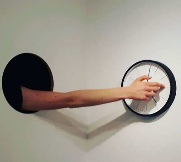 In ‘Clock Work’ 2019 a performer’s arm emerges from the wall every now and again to make you notice the clock it adjusts, even when you don’t need to know the time. Part of Tom Lovelace’s ingeniously staged show ‘Interval’, which also turns the floor, velvet covers and the action of the sun into interesting photographic works. I guess it’s the clock’s third hand…