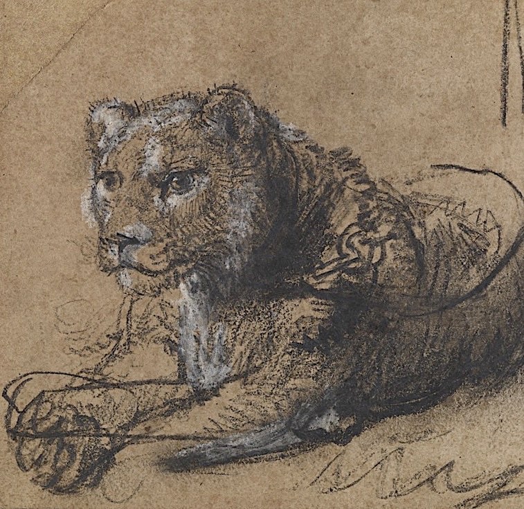 Two related studies depicting the same lion from side views are housed in the British Museum. While those drawings feature elegant, fluid lines to define the animal’s body, Young Lion Resting—owned by Kaplan’s Leiden Collection—displays more deliberate contouring, with subtle adjustments around the forepaws that reveal Rembrandt’s evolving study of the creature.