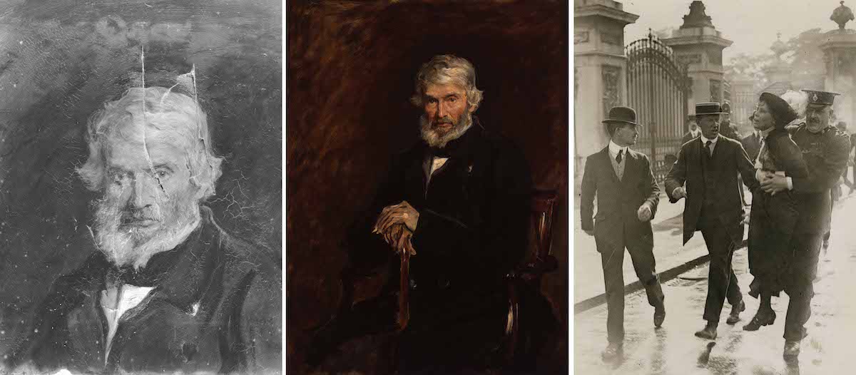 The National Portrait Gallery has revealed archival accounts of the incident that was carried out by Anne Hunt following the re-arrest of Suffragette leader Emmeline Pankhurst. On the morning of the attack, which occurred on a student day, meaning all non-students paid an entry fee, gallery staff attendant David Wilson recognised Anne Hunt from the previous day; he had thought her American ‘from the closeness from which she then examined the pictures.’ Wilson’s suspicions were aroused because ‘no American would have paid the 6d entrance fee twice over’. Unable to follow her beyond his post, he then heard glass shatter. Two female students were copying portraits when Hunt struck at least three times, slashing Carlyle’s portrait. One student, followed by an attendant, rushed to restrain her.