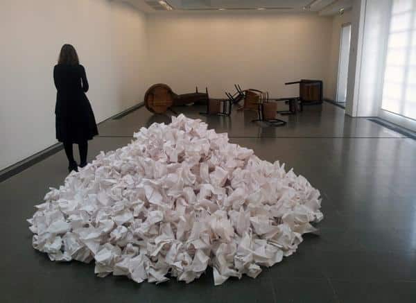 An aspect to this exhibition is currently making headlines; Ruthenbeck’s installation of a room full of overturned furniture has drawn attacks of a verbal nature from the public. The installation at the far end of a wing of the Serpentine, was created in 1971 by the German sculptor – and has been compared to a “study (the ‘reading’ kind one would assume, not the artistic) ready to be tidied up”. But countering the usual cries of derision; the piece is actually a highly traditional piece of installation art.