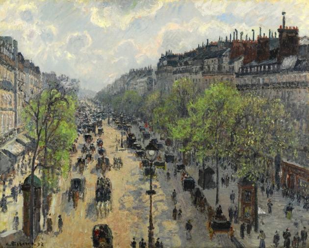 The artist was able to exploit the artistic possibilities presented by the new urban landscape of Paris that Haussmann’s renovations to the city had created. He extolled the artistic possibilities in a letter to his son Lucien: ‘It may not be very aesthetic, but I’m delighted to be able to have a go at Paris streets, which are said to be ugly, but are [in fact] so silvery, so bright, so vibrant with life […] they’re so totally modern!’ ** Pissarro’s views of Paris focused principally on the new vistas, which not only proved highly successful artistically but also critically and commercially, since the extensive grid of straight roads, avenues and boulevards was the setting for a burgeoning middle-class, whose appetite for modern painting far outstripped that of the established aristocracy.