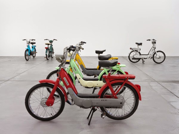 Eva Presenhuber has three large spaces in Zurich, one with an impressive and varied show by Valentin Carron, Switzerland’s last Venice Biennale rep. In contrast to Leuba, he has lovingly restored several of the Ciao mopeds (made in Italy 1967-2006). Why so? Carron says moped displays neither power nor speed and is ‘actually the vehicle of two forms of marginality: the marginality of youth in its quest for evasion and emancipation as well as the marginality of drop-out adults who populate the European countryside and villages’.
