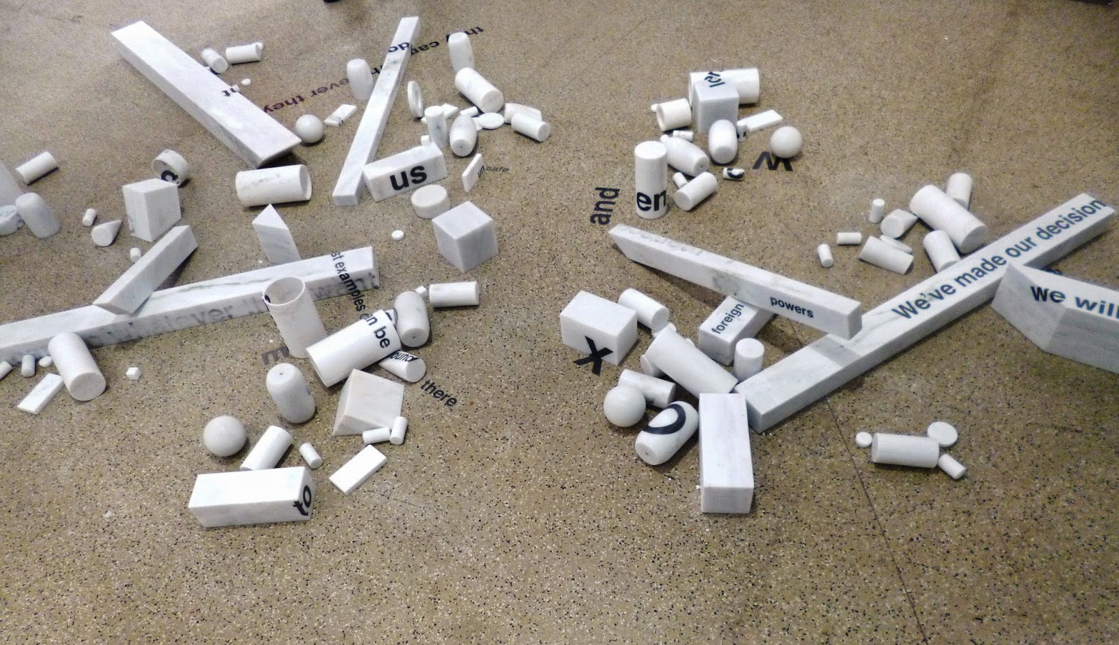 When this marble floor scatter caught my attention, there was the Amsterdam-based Greek artist to explain that not only did it suggest fallen classical ruins and the arrangements of Malevich’s Suprematist compositions, but that he had taken the shapes from empty tear gas canisters together with the bottles, stone and bits of wood typically left on the street after a demonstration. The words incorporated were taken from online accounts of an anti-government demonstration: they read as likely protesters’ slogans… but were actually quoting the Turkish prime minister.