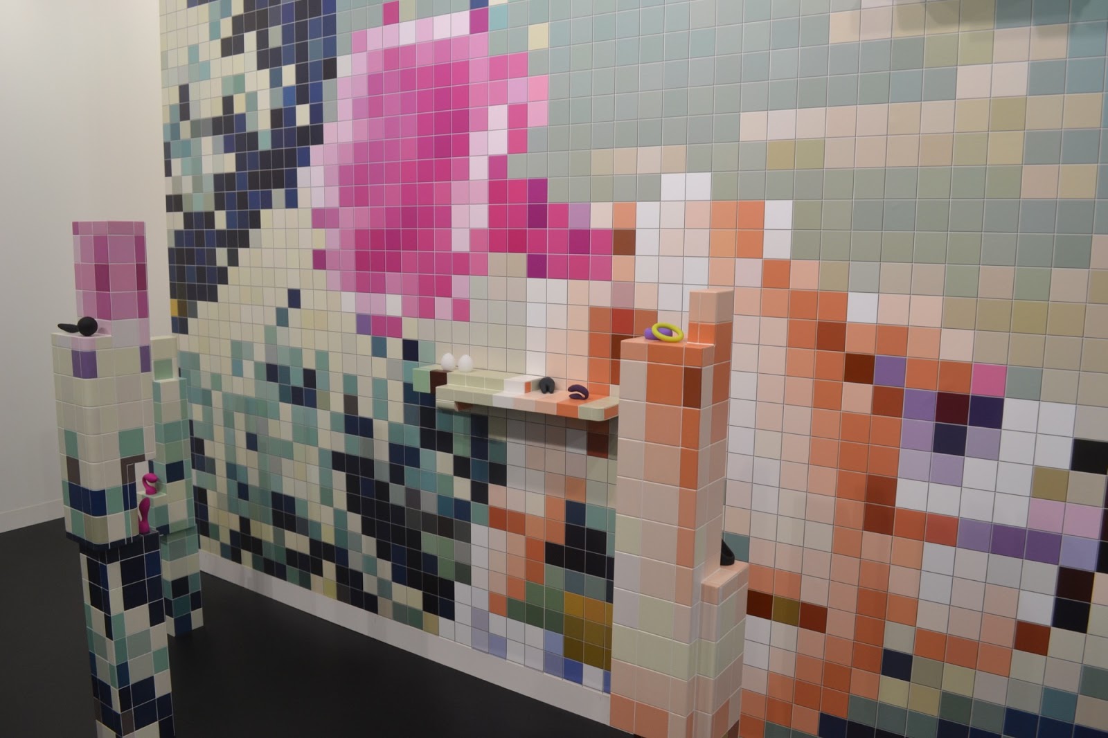 At 10 metres, the most imposing work in the xx stop Art Parcors route of art placed in the environs of the cathedral was Ugo Rondinone’s stone sculpture which used modern quarrying and carving techniques to mimic a prehistoric monument. The figure rose to the level of surrounding four storey buildings. Yet I suspect the project for which plans could be seen in Sadie Coles’ booth might trump even that (despite the best pink and blue preview efforts of the local schoolchildren in my photo above). The New York based Swiss artist intends to build a mountain of sorts from hyper-intensely coloured piles of boulders. The gallery presented three of these in front of comparably hued work by Jonathan Horowitz to provide the chroma-spectacle of the fair.