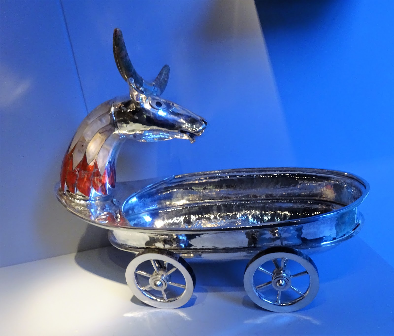 Now for a head unexpectedly present. Goudji is a Georgian metalsmith and sculptor who married the French ambassador’s daughter and, after a few years’ Cold War stresses, was allowed to emigrate to France in 1974. His striking productions are all usable, even if there’s no obvious reason for a fruit bowl to have a head or wheels, at least you know which way to roll it down the long aristocratic table.
