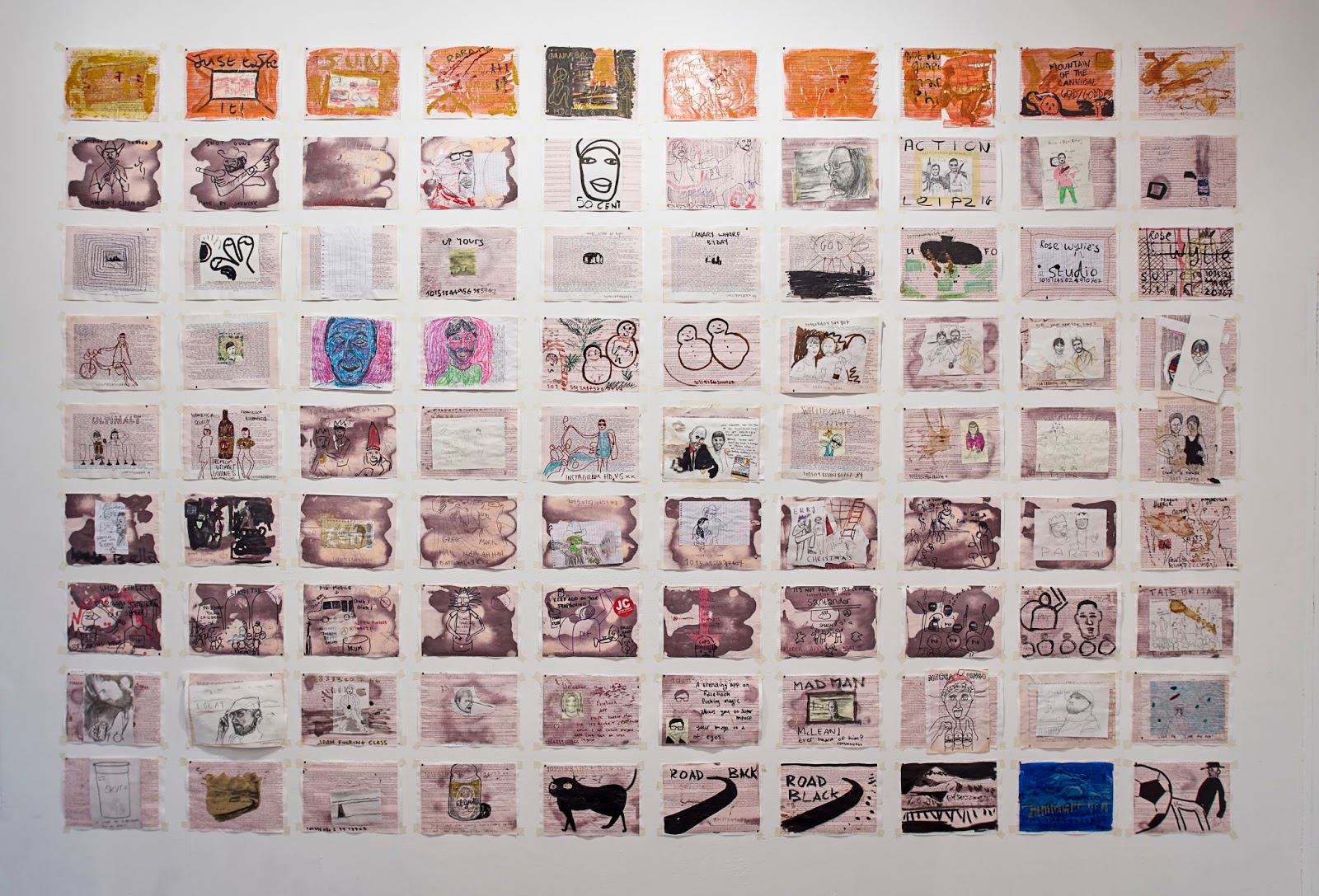 Installation view at Roman Road: letters with photos and the whole room covered in fake brick effect id Painting 12, 2015 – Acrylic on canvas, 360 x 180 cm