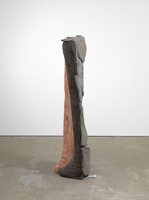 British artist Michael Dean produces sculptures linked to language, typically through texts , dialogues of unallocated voices, or minimal, repetitious utterances of letters and words. Text and sculpture go hand in hand. Often the sculpture gives disguised form to letters, here (for £16,000) it’s a concrete tombstone of tongues, big grey ones on the front, a massive pink one behind, with a book which repeats hmm.. trapped underneath. Even hesitant pondering seems to be squashed. The tongues’ surfaces have an appropriate texture of crinkled would-be-sliminess, caused by covering the wet surface with cling film, then peeling it off.