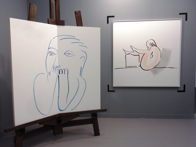 Brazilian sculptor Efrain Almeida deals with nature,body, sexuality and religion. He showed an installation (£42,5000) of ten polychromatic bronze hummingbirds, painted in natural-looking colours of the artist’s devising. They were life-size – 12 cm long – and attaching them by their long beaks made good sense. You could imagine them sipping at flowers, but they did also appear to be flying into the wall, next wingbeat kissing the void. Adding to the off kilter effect was what Almeida showed alongside the birds: two unflattering versions of his fifty-ish, pot-bellied self, naked.