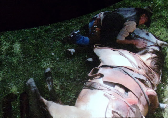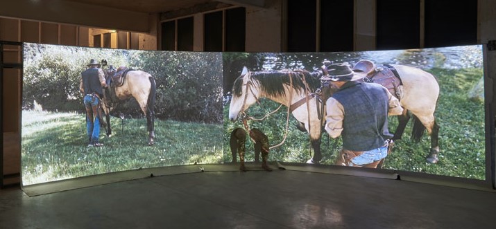 Robin Klassnik’s new – albeit temporary – space kicks off with an immersive video-performance-sculpture by Leah Capaldi. A 21 minute double projection film loop shows the ‘natural horsemanship’ of a Utah cowboy as he cajoles his steed into lying on the ground. Against all the instincts of a flight animal, the horse arrives at what its handler calls ‘a very tender energy moment’. The vast screen is silicone, giving it a horse flank’s ripple potential and allowing the legs and arm of a participant to push through holes cut in it, so complicating our understanding of what is image, what object, and what animal; and emphasising the human parallels to be drawn from the demonstration of how love can generate trust.