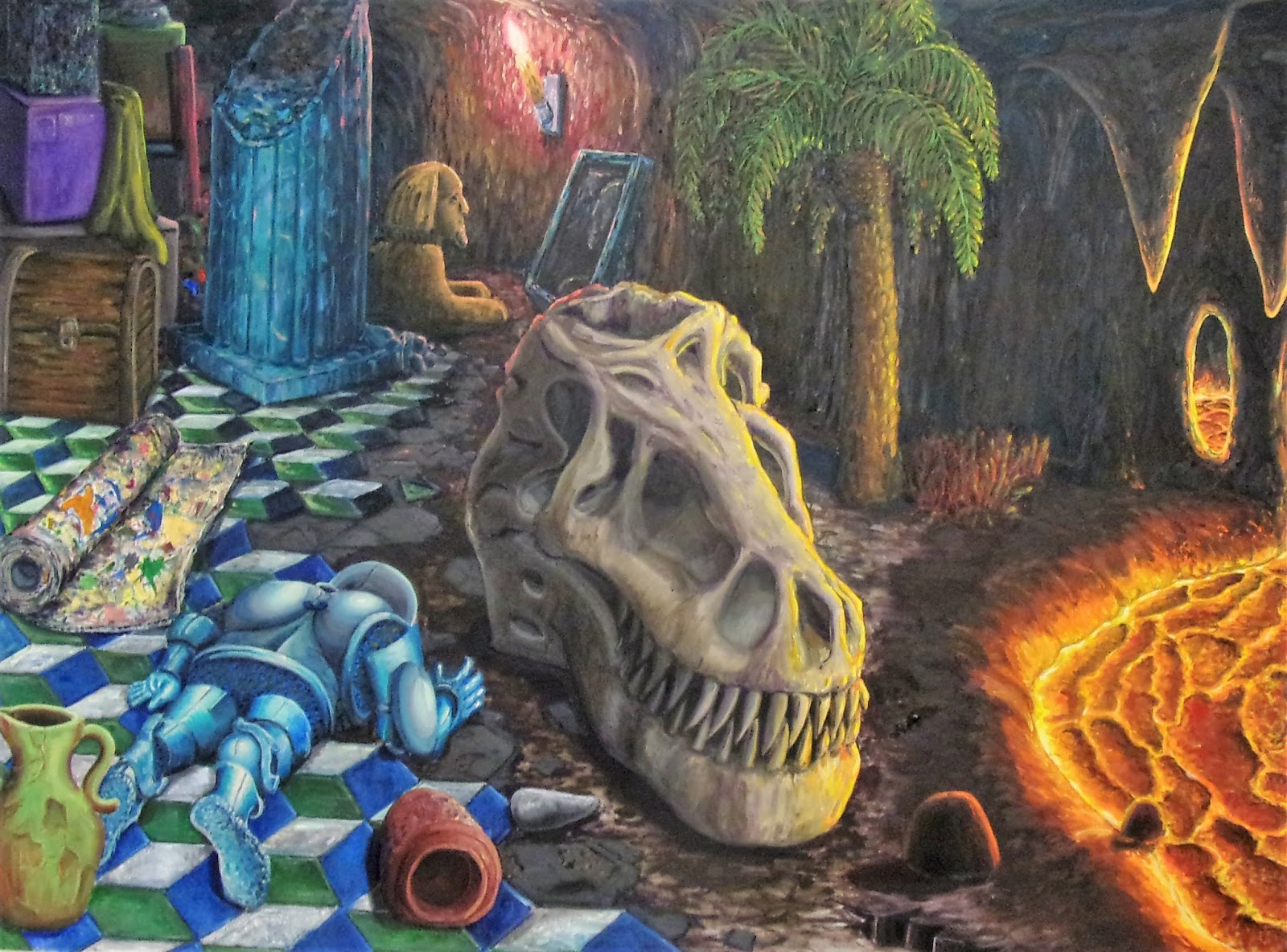 Paul Housley pulls a selection from his crowded studio walls to reflect on his practice, forming an indirect self-portrait which loops back to its making. There’s a van Gogh-ish chair, an empty frame, England burning, a tiny version of the artist as one-eyed adolescent pirate (aren’t they all, to some extent?), and a paint factory, referring to both Housley’s time in Sheffield and the possibility that the building is now an artist’s studio, and insinuating a joke – are all painted factories ‘paint factories’? Add some characterful little sculptures such a head of the artist carved in wood, and the forward motion of the new gallery, while it’s hardly a palace yet, continues in this fourth show.