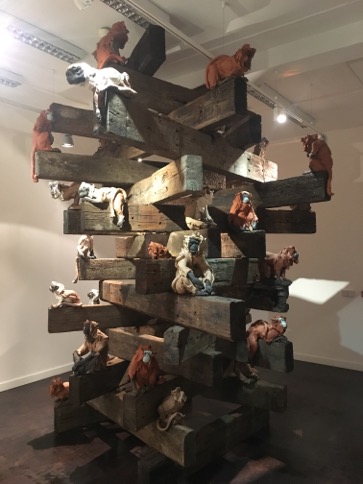 This is a remarkable enterprise from commercial gallery, an extensive survey through art and historic illustrations of our relationships with animals with full curatorial apparatus (from Jens Hoffman) and 70 participant ‘creatures’ unerringly chosen – if this were the Tate and you had to pay to get in, no one would complain. It’s a bit futile to select highlights, but hard not to notice John Baldassari’s giant white camel ready to pass through a needle,  Carsten Höller’s purple octopus, an enormous tiger portrait by Robert Longo, and Steve McQueen’s highly charged film of a dead horse. At the other end of the scale, it would be easy to miss Maurizio Cattelan’s mouse house or Jacub Julian Ziółkowski high-hung dog’s soul.