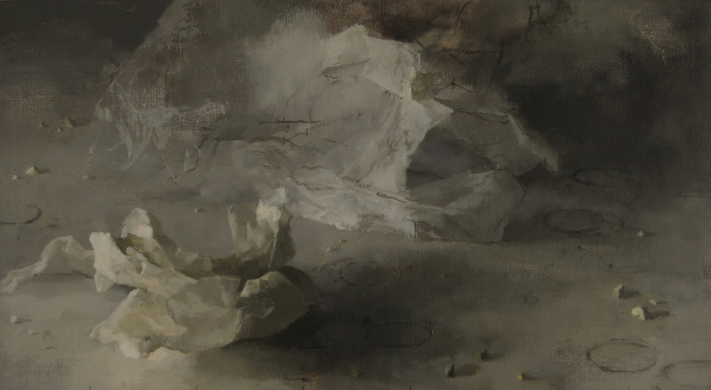 Painting is well suited to ambiguity: a photograph may be deceptive, but once you know what it is the matter is concluded. But there’s no fact of the matter in a painting, which Claudia Carr exploits to the full in her  pictures derived from small objects arranged in the studio, here restricted to calmly lyrical black, white and ochre: she exploits ambiguities of genre (still life, landscape or abstract?), place (are under water or on the moon?) scale (is that a pebble, rock or mountain?) and tone (naturalistic or surreal?).