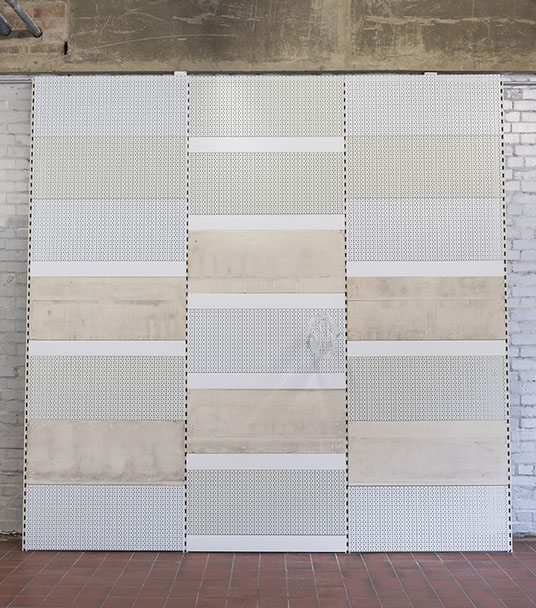 Clouds (I), 2016 found shop panels, powder-coated shop panels, uprights, pegs, hand-blown glass