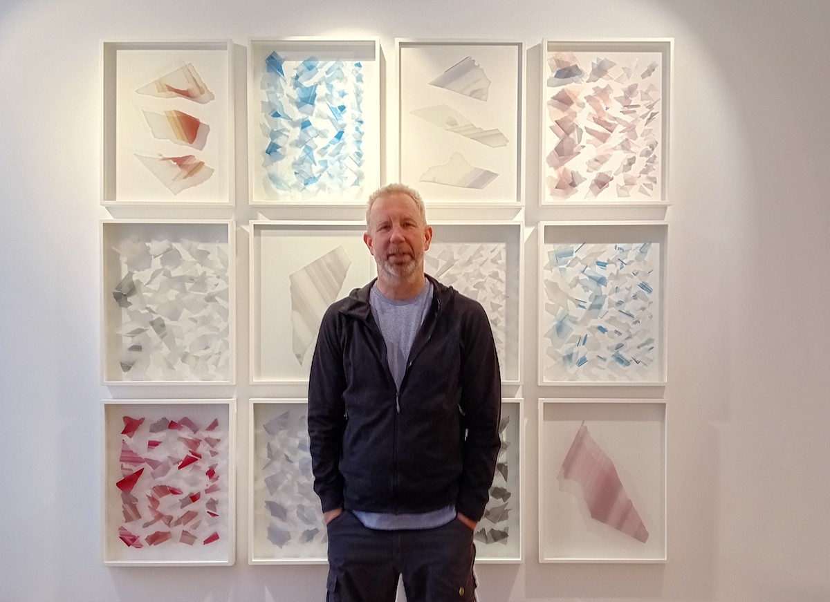 You could say, then, that Butcher’s artistic practice now feeds on itself. As he has explained[v], he pulls his previous works apart ‘both intellectually and physically, peeling the skins of paint from their supports and categorising them according to a basic taxonomy, subjecting my entire practice to a sort of forensic examination’. The resulting skins, fragments, and traces of paint are sandwiched between sheets of glass, much like specimens. The business of recycling paint skins is painstaking. Butcher fixes them to a sheet of transparent adhesive, and then he cuts around each one, meticulously, with a scalpel. He can tell where they are likely to break – along the lines of striations – but cannot fully control the process.