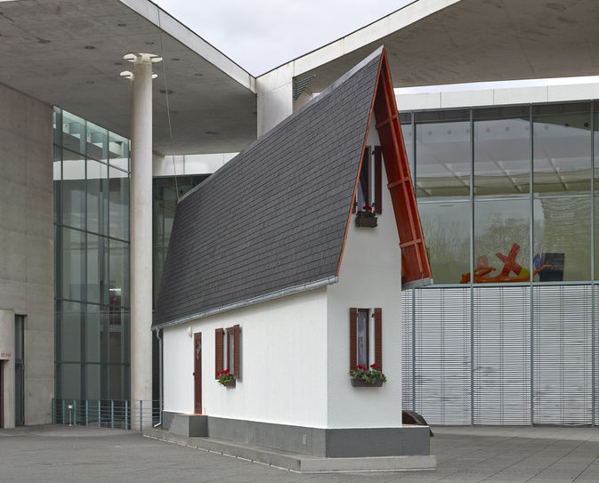 The Kunstmuseum’s biggest show was installation-based: 21 artists who had made uncanny spaces into which the viewer was frequently invited. Or as the press release put it ‘HEIMsuchung is about the transition from a formerly intimidating exterior to an intimidating interior and the parallelization between destabilized subjects and unstable spaces’. It sounds hard work, but that translates into chances to experience such fun as curved and mirrored multiplicities, furniture which moves, interior ice, a couple who go about everyday life while on fire, a room being crushed, a fall-out shelter made from books on German art, intense greyness, melting interiors and a whole houseful of narrowness – that being the version of Erwin Wurm’s childhood home set up outside the gallery.