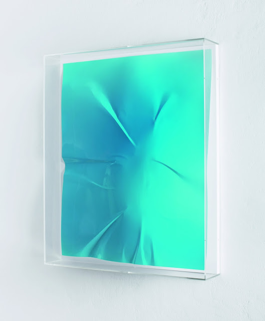 A grouped dozen of creased and folded Lighter series, three dimensional monochromes folded / creased / crumpled into a three dimensional states to yield the corporeal presence of specimens in their perspex boxes, and to reflect light differently to different viewpoints.