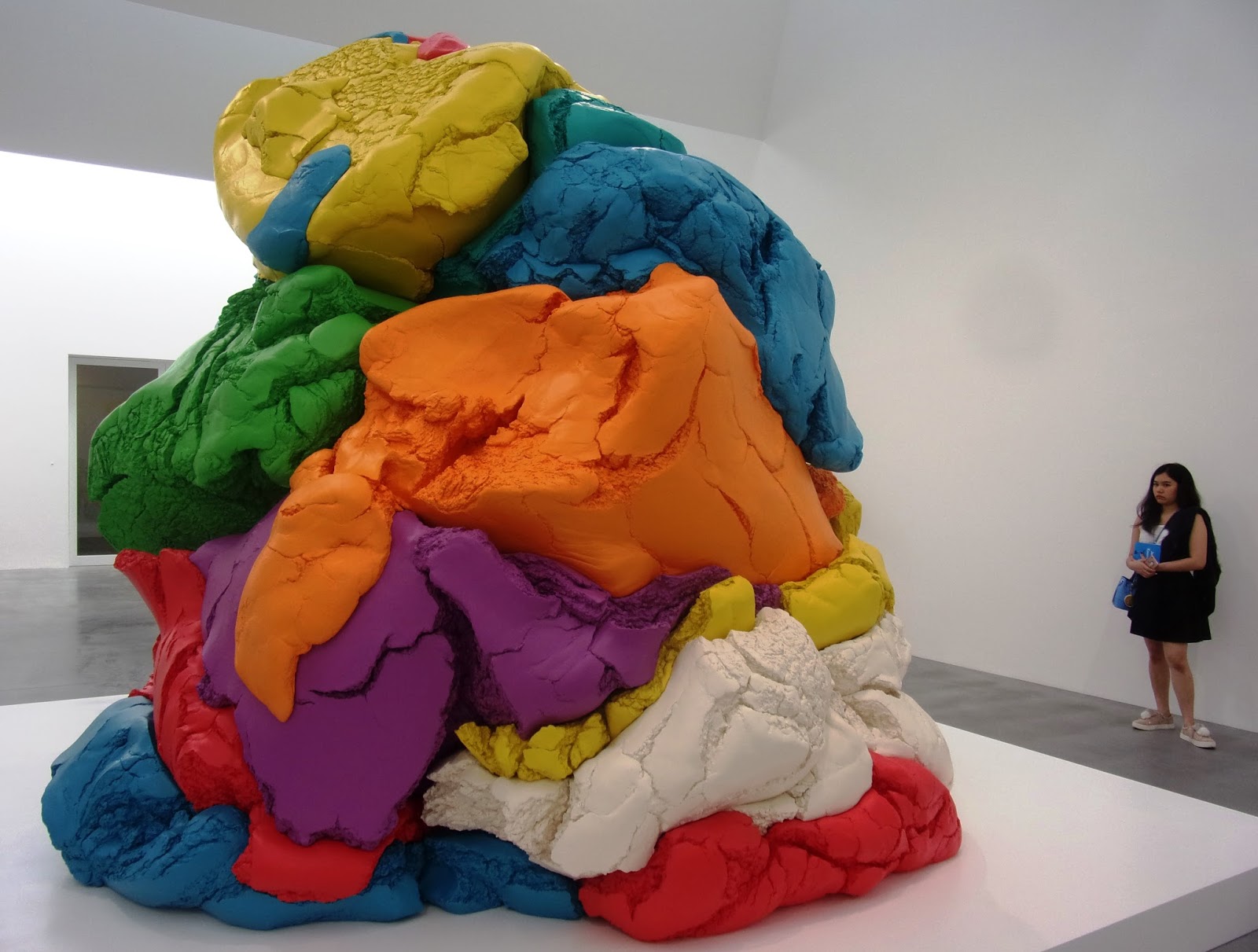Damien Hirst, in his more than impressive new space, provides a punchily presented and much less predictable overview of Koons than I’d expected: hoovers and basketballs present and welcome, but also early inflatables to tee up the later stainless steel blown-up big ‘can’t-believe-it’s-not-vinyl’ ones; a bigger balloon ‘celebration’ than has been shown in London before; giant eggs as well as Jeff’s own sperm on Illona’s face; the 27 aluminium casts which make up the monstrous child’s play of ‘Play Doh’…